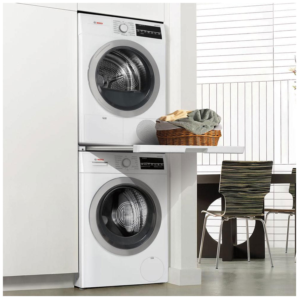 Соединительный элемент Bosch WTZ11400 позволяет удобно установить сушилку на стиральную машину в целях большего комфорта и экономии свободного пространства. Аксессуар производится из прочного пластика и имеет приятную белую расцветку. Это обеспечивает визуальную совместимость практически с любыми моделями.Изделие Bosch WTZ11400 имеет выдвижную конструкцию для выполнения функции удобной полки для размещения белья.