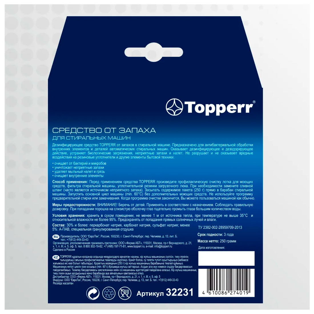 Дезинфицирующее средство TOPPERR от запаха в стиральной машине. Предназначено для антибактериальной обработки внутренних элементов и деталей автоматических стиральных машин. Оказывает дезинфицирующее и дезодорирующее действие, устраняет биологические загрязнения, неприятные запахи и налет.
