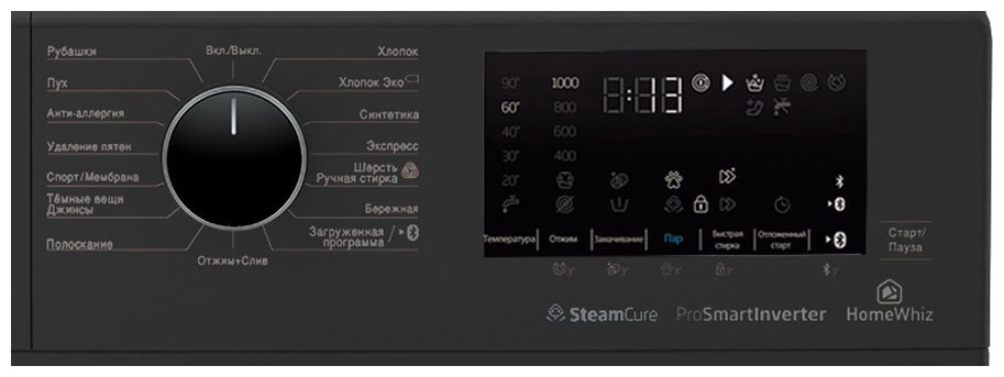 Беспроводное управление HomeWhiz позволяет следить за стиркой и управлять работой стиральной машины с вашего смартфона или планшета.Особенности:Нагревательный элемент Hi-Tech. Защита от накипиНагревательный элемент Hi-Tech с никелированным покрытием защитит стиральную машину от образования накипи и ржавчины. Это увеличит срок её службы в несколько раз и избавит вас от расходов на средства для смягчения воды и удаления накипи.Технология обработки паром SteamCureТехнология SteamCure отстирает даже пятна от травы, красок и сладостей на детской одежде.