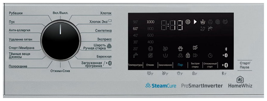 Беспроводное управление HomeWhiz позволяет следить за стиркой и управлять работой стиральной машины с вашего смартфона или планшета.Особенности:Нагревательный элемент Hi-Tech. Защита от накипиНагревательный элемент Hi-Tech с никелированным покрытием защитит стиральную машину от образования накипи и ржавчины. Это увеличит срок её службы в несколько раз и избавит вас от расходов на средства для смягчения воды и удаления накипи.Технология обработки паром SteamCureТехнология SteamCure отстирает даже пятна от травы, красок и сладостей на детской одежде.
