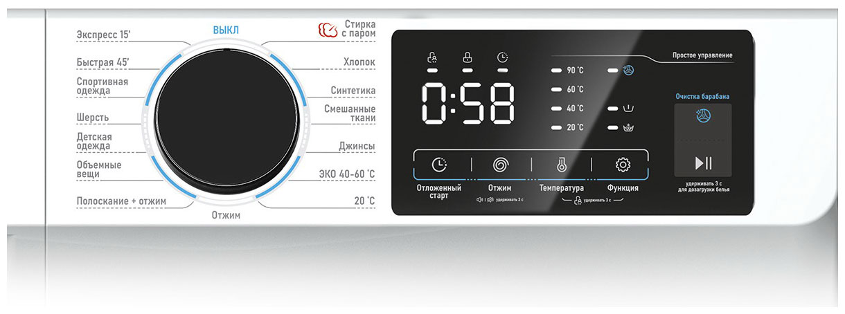 Общие данные: Габариты: 85×59.5×40 смМаксимальная загрузка: 7 кгСкорость отжима: 1200 об/минКласс стирки: AКласс отжима: BКласс энергопотребления: AПрограммы: Стирка с паромХлопокСинтетикаСмешанные тканиДжинсыЭко20 градусовЭкспресс 15 минБыстрая 45 минСпортивная одеждаШерстьДетская одеждаОбъемные вещиПолоскание отжимОтжимДополнительные функции: Отсрочка стартаВыбор скорости отжимаВыбор температуры стиркиОчистка барабанаПредварительная стиркаДополнительное полосканиеУправление и индикация: Сенсорное управлениеLED-дисплейЗвуковой сигналБез звукаБезопасность: Блокировка от детейДополнительная информация: Инверторная системаОбъем барабана: 45 лМощность: 2000 ВтУровень шума: 59/79 дБ (стирка/отжим)Потребление воды за цикл: 45 лЭнергопотребление за цикл: 0,784 кВт/чНеобходимое давление в водопроводе: 0,05 – 1 МПа