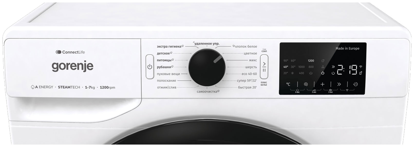 Основные сведения:Габариты: 85х60×46.5 смМаксимальная загрузка: 7 кгСкорость отжима: 1200 об/минКласс стирки: AКласс отжима: BКласс энергопотребления: AПрограммы: 15Стирка шерсти/Ручная стиркаМикс/СинтетикаХлопок Быстрая 2039;Эко 40-60РубашкиПитомцыЭкстрагигиенаПуховые вещиИнтенсивная 5939;Детская одежда Полоскание/СмягчениеСамоочистка SterilTubОтжим/Слив Дополнительные функции:Быстрый режимIntensiveCareНормальный режим Установка окончания стиркиОстановка с водой в бакеСокращение программы – две опцииПаузаСохранение пользовательских настроекДозагрузка бельяБыстрая стирка (сокращение программы)Больше водыРегулировка температурыПропустить отжимЛегко гладитьПредварительная стирка SteamTech: обработка паромСенсор уровня водыСенсор температурыСенсор загрузкиСенсор пены Управление и индикация:Wi-Fi управление: интегрированныйConnectLifeЦифровой дисплей Кнопка Старт/ПаузаЗвуковой сигнал Создание программУстановка Холодной стирки кнопкой Системы безопасности:Блокировка управления Защита от переливаДополнительная информация:Уровень шума дБ (А): 55Уровень шума во время отжима дБ (А): 70Ребра жесткости StableTechОбъем барабана: 49 лБарабан WaveActiveМотор Inverter PowerDriveПродолжительность программы (Деликатная 30С/40С): 67 мин.Продолжительность программы при 40С: 195 мин.Продолжительность программы при 60С: 214 мин.Продолжительность программы при 90С/95С: 218 мин.Расход воды (Деликатная 30С/40С): 45 лРасход воды (Хлопок 40С): 51 лРасход воды (Хлопок 90С/95С): 55 лРасход воды (Шерсть 30С): 45 лРасход воды за год: 9586 лРасход воды за цикл: 51 лРасход электроэнергии за цикл: 0.81 кВтчОриентировочное годовое потребление электроэнергии: 160 кВтчПлоская дверцаДозатор с тремя отделениями Напряжение: 220-240 BМощность подключения: 1900 ВтВес: 61.3 кг