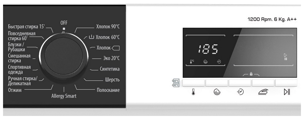 Общие данные: Габариты: 84,5х59,7х41,6 смМаксимальная загрузка: 6 кгСкорость отжима: 1200 об/минКласс стирки: A Класс отжима: BКласс энергопотребления: AПрограммы стирки:ХлопокЭкоСинтетикаШерстьБыстрая 15 минПовседневнаяБлузки/РубашкиСмешаннаяСпортивная одеждаРучная/ДеликатнаяОтжимПолосканиеДополнительные функции: Легкая глажкаРегулировка отсрочки старта с помощью кнопкиРегулировка температуры с помощью кнопкиРегулировка скорость вращения с помощью кнопкиУправление и индикация: 7ми-сегментный LED дисплейОставшееся времяВремя отсрочкиИндикатор цикла стиркиСистемы безопасности:Защита от пеныКонтроль дисбалансаЗащита от протечекСистема контроля: электронная Система обнаружения ошибок Защита от детей Дополнительная информация: Тип мотора: AC Eco-Logic системаШирокооткрывающаяся дверьДиаметр отверстия загрузки: 33 см Диаметр двери: 47 см Насос с фильтромМатериал барабана: нержавеющая сталь Материал бака: полипропилен Кол-во отсеков в отделении для порошка: 3 Съемная крышка Регулируемые ножки даОбъем барабана (л): 41Длительность Программы (мин) хлопок 60 C (полная загрузка) : 200 Длительность Программы (мин) хлопок 60 C (частичная загрузка): 165 Длительность Программы (мин) хлопок 40 C (частичная загрузка): 160
