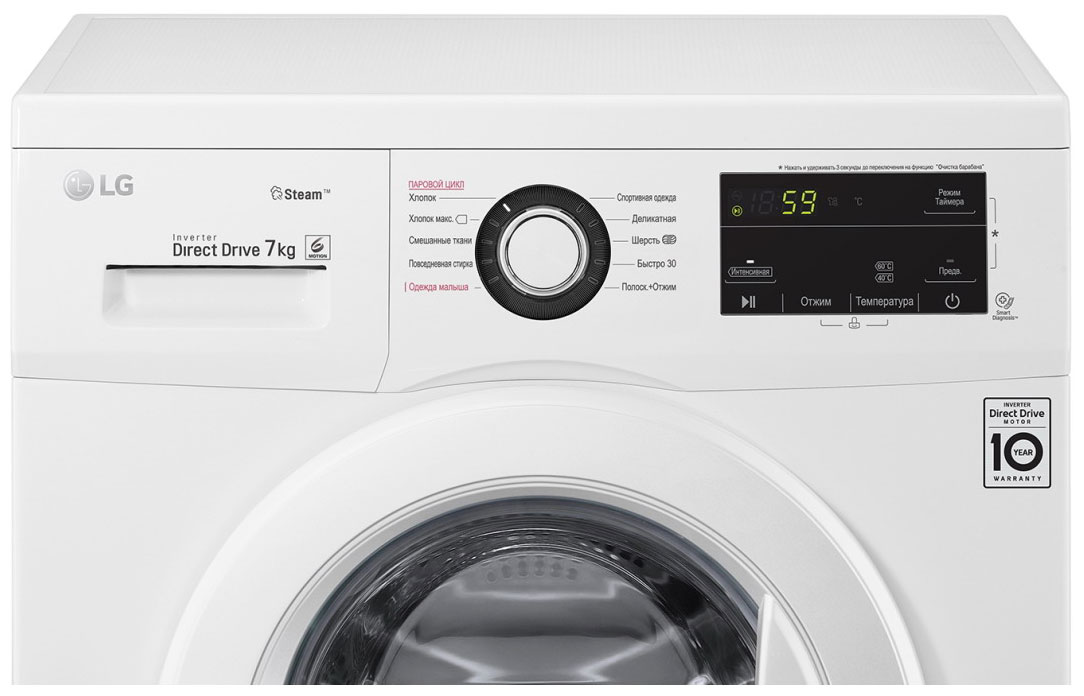 Общие данные:Габариты: 85х60х44 смМаксимальная загрузка: 7 кгСкорость отжима: 1200 об/минКласс стирки: AКласс отжима: BКласс энергопотребления: АПрограммы стирки:ХлопокХлопок макс.ПовседневнаяСмешанные тканиСпортивная одеждаБыстро 30ДеликатнаяШерстьПолосканиеОтжимОдежда малышаДополнительные функции:Функция пара SpaSteamФункция очистки барабанаВыбор скорости отжимаВыбор температуры стирки: Холодная/20/30/40/60/95Таймер отсрочки (3-19 ч)Предварительная стиркаИнтенсивная стиркаБез отжимаУправление и индикация:Сенсорный LED дисплейАвтоперезапуск AutorestartЗвуковой сигнал Вкл/ВыклИндикатор рабочего циклаИндикатор ошибок / СамодиагностикаИндикатор блокировки дверцыИндикатор времени до конца циклаСистемы безопасности:Функция защиты от пенообразованияДетектор загрузкиАвтобалансировкаБлокировка от детейДополнительная информация:Система Прямого Привода Inverter Direct DriveТехнология 6 движений заботы 6 MotionМобильная диагностика SmartDiagnosisНизкий уровень шума и вибрацииИнтеллектуальная система стиркиКоличество программ стирки / дополнительных режимов: 10/3Диаметр загрузочного люка, см / угол открытия двери: 30 / 180Пузырьковая поверхность барабанаРегулируемые опоры (мм): 10Глубина с учетом двери, мм: 460Цвет корпуса / Цвет дверцы / Цвет панели управления / Цвет дисплея: Белый / Белый / Белый / ЧерныйУровень шума стирка/отжим: 55/73 дБРасход воды (л): 56Энергопотребление, (кВтч): 1,06