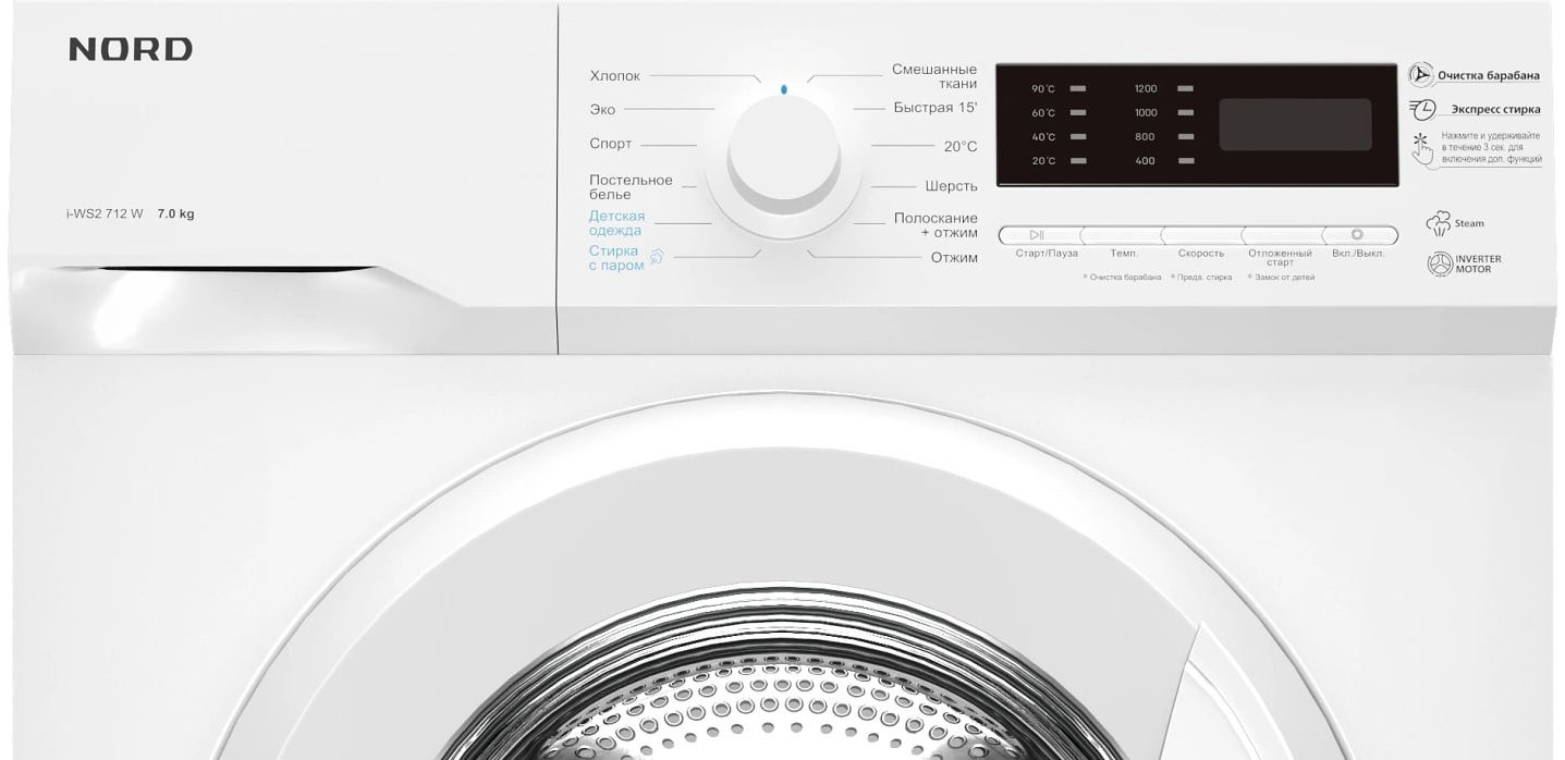 Инверторная стиральная машина NORD i-WS2 712 W с функцией стирки с паром порадует отличными показателями она способна постирать до 7 кг белья за один цикл, а скорость отжима доходит до 1200 оборотов в минуту. Инверторный мотор работает тише стандартного, отличается долговечностью и способствует ресурсосбережению, что подтверждено высоким классом энергоэффективности А.Для выбора режима, температуры и дополнительных функций на панели управления есть кнопки и механический диск, а посмотреть все параметры настроек можно на расположенном рядом LED-дисплее.В модели предусмотрено 12 автоматических программ: Хлопок, Эко, Спорт, Постельное белье, Детская одежда, Стирка с паром, Смешанные ткани, 20 C, 15 Быстрая стирка, Шерсть, Отжим, Полосканиеотжим.Стиральная машина оснащена интеллектуальной программой Smart, которая позволяет запустить стирку в одно касание.