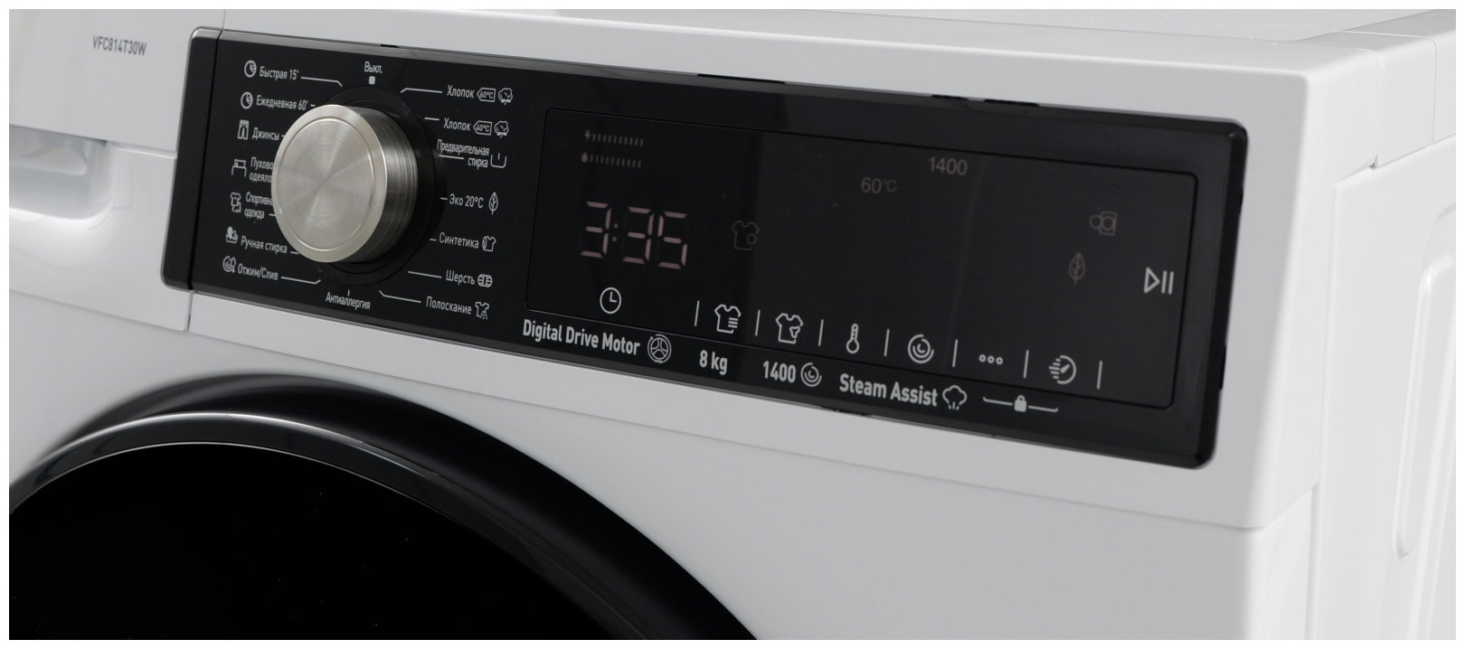 Общие данные:Габариты: 84.5х59.7х55.7 смМаксимальная загрузка: 8 кгСкорость отжима: 1400 об/минКласс стирки: AКласс отжима: В Класс энергопотребления: AКоличество программ: 15Дополнительные функции:Уровень загрязненияТип пятенТемператураСкорость отжимаПар (Steam Assist)Дополнительное полосканиеЛегкая глажкаПредварительная стиркаУправление и индикация:Электронное управлениеДисплей: LEDКнопки управления: TouchПрограмматор: Jog Dial (сделайте выбор легким вращением)Дополнительная информация: Boomerang (дополнительная жесткость конструкции, уменьшение вибрации) Барабан: Pearl Drum Мощьность подключения, Вт: 2200 Расход электроэнергии КВтч/год: 194Расход воды л/год: 10224Уровень шума стирка, дБ: 58Уровень шума отжим, дБ: 78