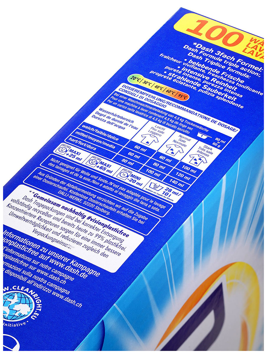 Подходит как для цветных, так и для белых вещей. Экономично расходуется. Может использоваться как для машинной, так и для ручной стирки.Все продукты Dash являются климатически нейтральными с июля 2021 года, т.
