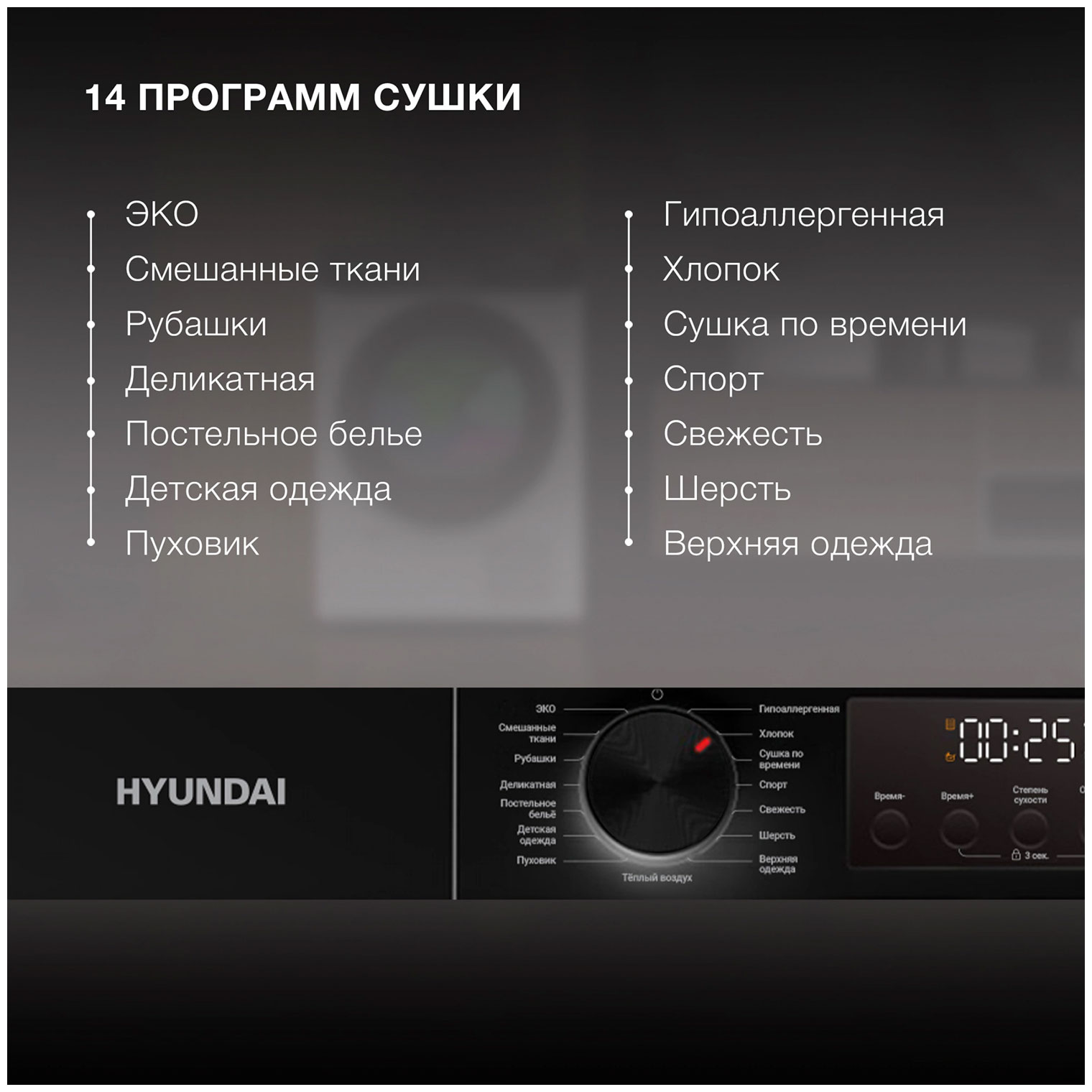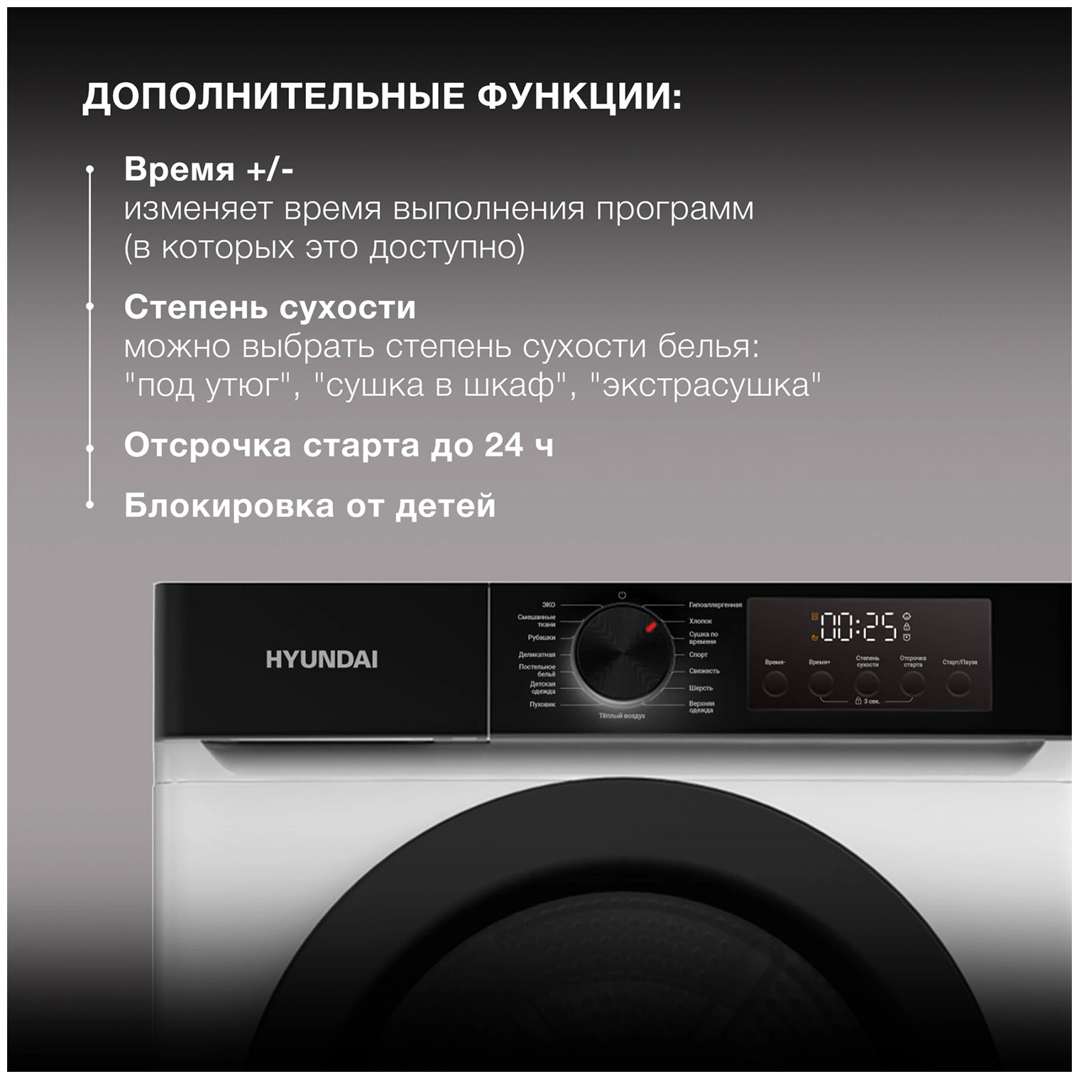 Общие данные:Габариты: 85×59.5×67 смМаксимальная загрузка: 9 кгКласс энергоэффективности: AПрограммы сушки: 14 программФункции: Освещение барабанаБлокировка от случайного нажатияУправление и индикация:ДисплейОтсрочка стартаМаксимальное время отсрочки старта: 24 чДополнительная информация:Материал барабана: нержавеющая стальУгол открытия люка: 140 Уровень шума: 64 дБ Цвет: белыйЦвет люка: черный Вес: 52 кг