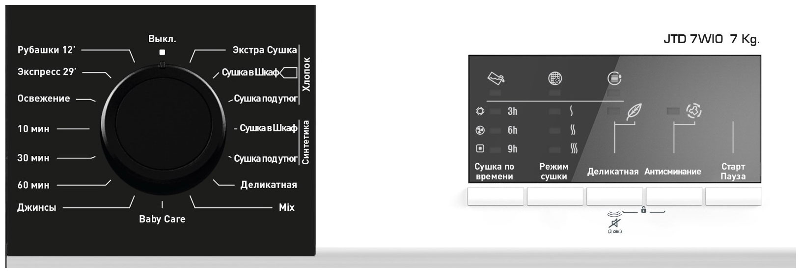 Общие данные:Габариты: 84.5х59.6х56.3 смМаксимальная загрузка: 7 кгКласс энергоэффективности: BПрограммы:Хлопок: Экстра сушка, В шкаф, Под утюгСинтетика: В шкаф, Под утюгДеликатнаяМиксРубашки 12 минЭкспресс 29 минОсвежение10 мин30 мин60 минДжинсыBaby CareДополнительные функции:Отсрочка стартаРегулировка уровня сушкиАвтоматическая функция защиты от сминанияФункция против сминания PLUSФункция ДеликатнаяУправление и индикация:Индикатор заполнения фильтраИндикатор заполнения бакаИндикатор очистки конденсатораЗуммер в конце циклаФункция отмены зуммераИндикатор циклы сушкиБезопасность:Система обнаружения неисправностейЗамок от детейДополнительная информация:Сенсорная система сушкиРеверсивное вращение барабанаПодсветка барабанаШироко открывающаяся дверьДиаметр двери: 47 смМатериал барабана: Нержавеющая стальПоложение дверной петли: справаРасположения резервуара для воды:сверхуСъемная верхняя крышкаРегулируемые ножкиОбъем барабана (л): 100