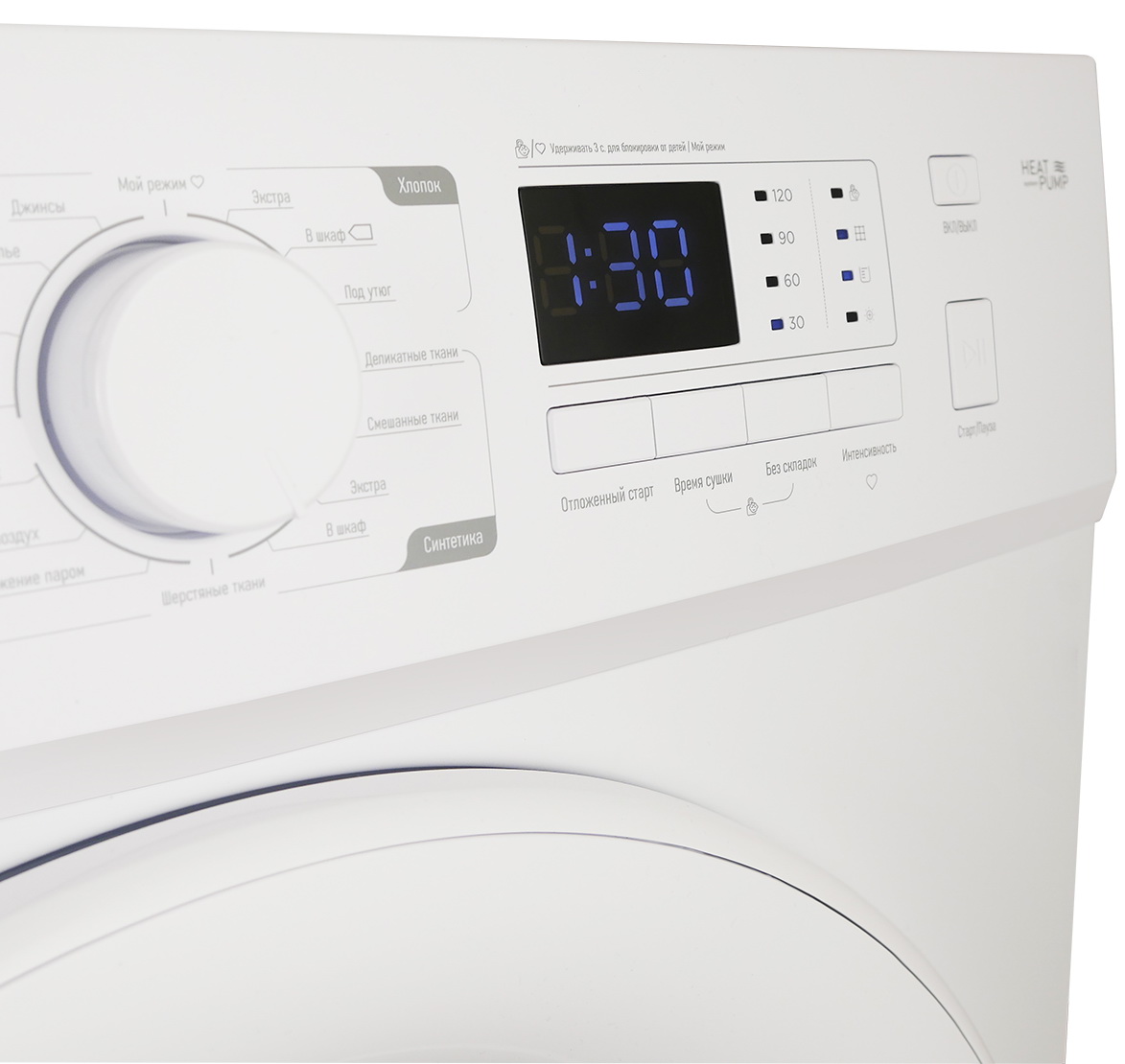 Машина укомплектована фильтром для задержки ворса, вещи после сушки выглядят опрятнее и не содержат бельевую пыль которая чаще всего является причиной аллергии. Объем загрузки составляет 8 кг, при этом габариты машины позволяют устанавливать ее в зависимости от потребности (штабелировать или горизонтально). Для выбора сушки по типу ткани у СТ-1990 присутствует 16 программ, есть возможность выбрать любимый режим которым чаще всего приходится пользоваться (МОЙ РЕЖИМ).