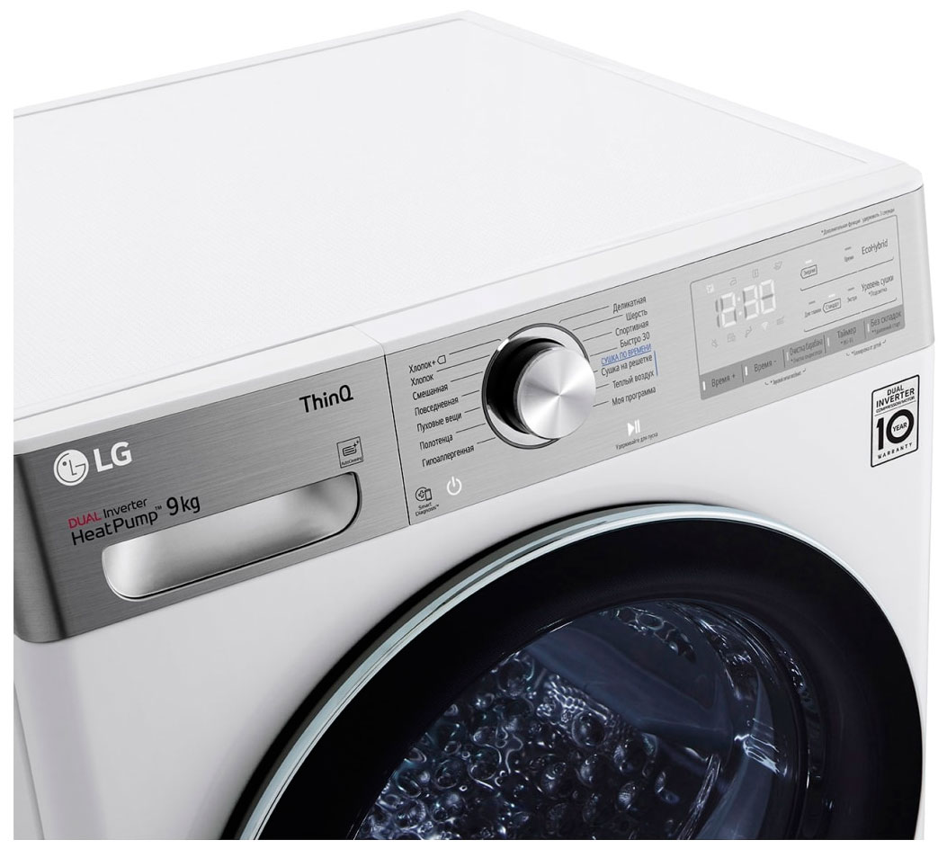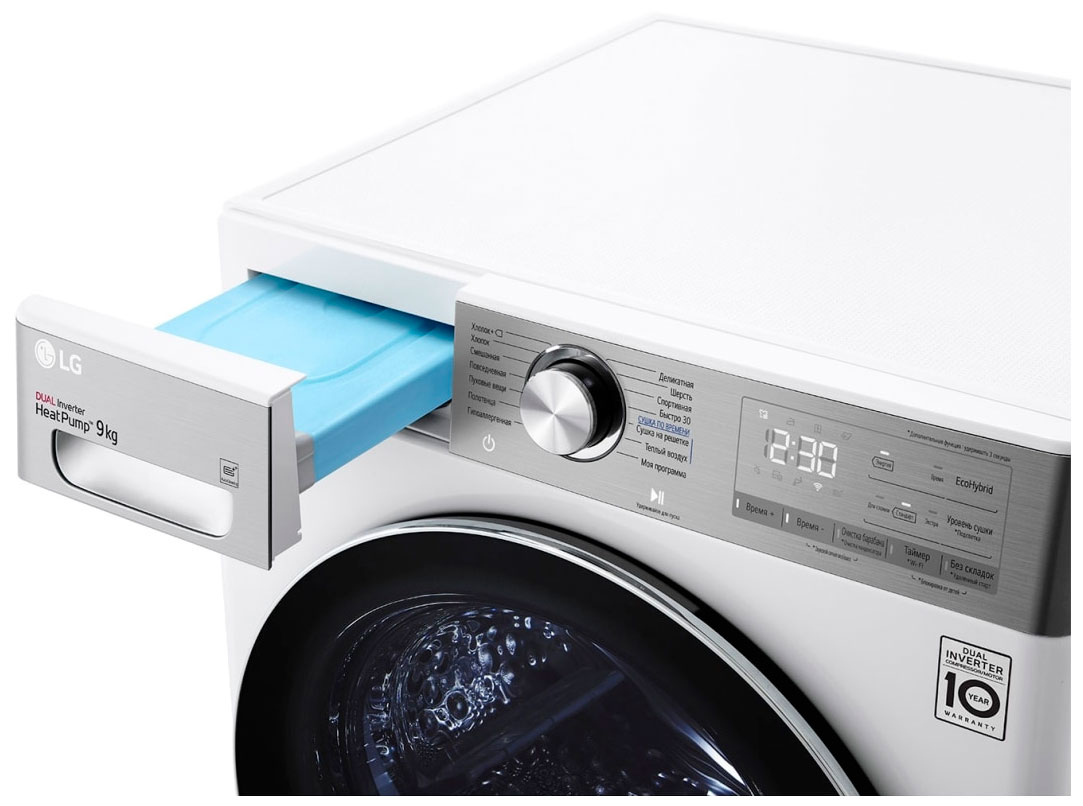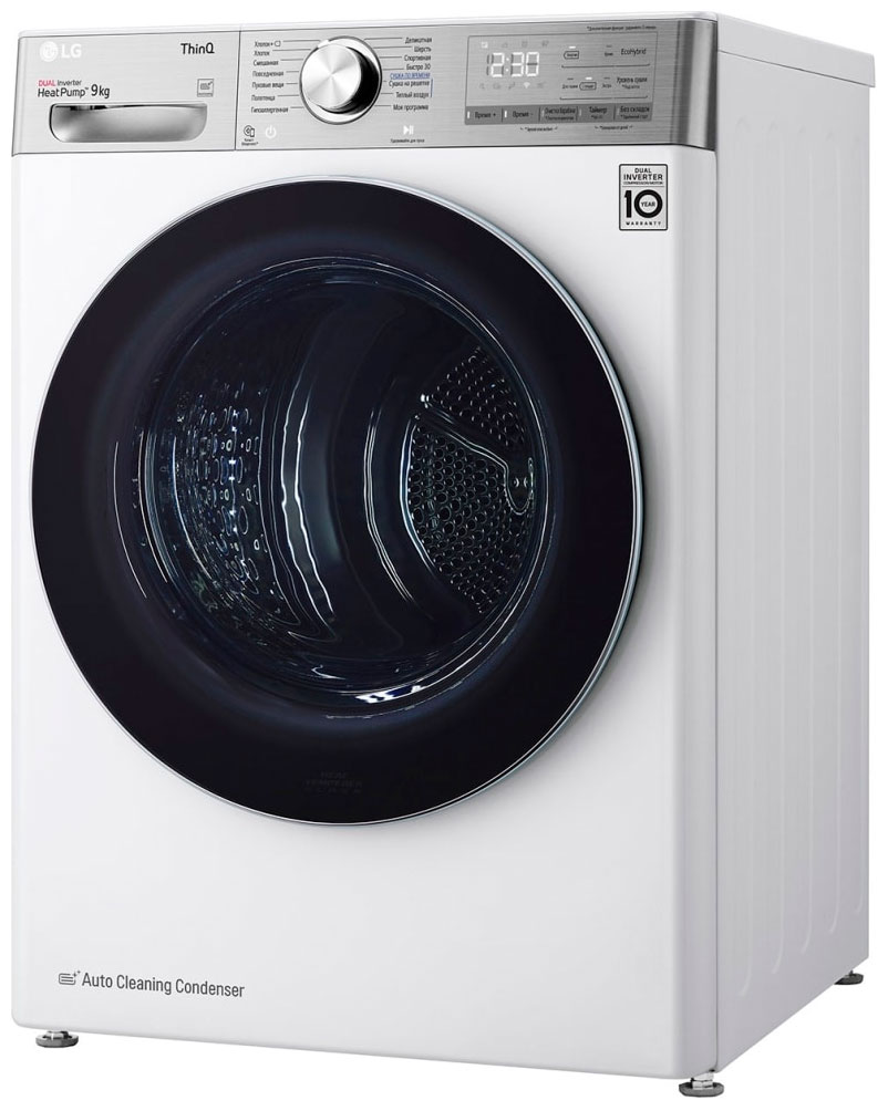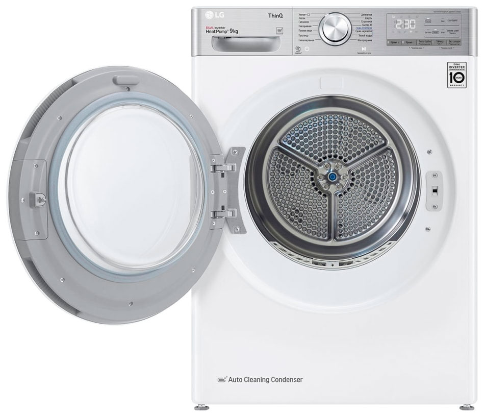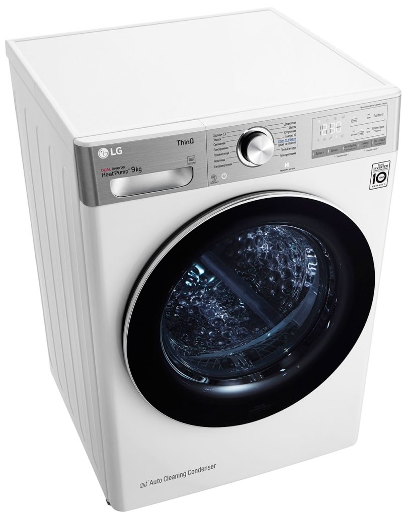 Стандартная сушильная машина c тепловым насосом и автоочисткой конденсатораОбщие данные:Габариты: 85х60х69 смМаксимальная загрузка: 9 кгКласс энергоэффективности: AПрограммы:14ХлопокСмешанные тканиПовседневные вещиПуховые вещиПолотенцаГипоаллергеннаяБыстро 30СпортивнаяШерстьДеликатнаяСушка на решеткеХолодный воздухТеплый воздух Дополнительные функции:Без складокЭкстраСтандартДля глажки Управление и индикация:Управление: переключатель сенсорный дисплей Wi-FiВозможность управления через приложение LG ThinQДисплей: LED Сенсорный дисплейИндикатор температурыИндикатор Пуск/ПаузаИндикатор ошибок/СамодиагностикаЗвуковой сигнал при ошибкеРежим таймера: 3-19ч Звуковой сигнал Вкл/ВыклИзбраннаяСохранить Время/Время- Удаленный старт Безопасность:Мобильная диагностика Smart Diagnosis: версия 3.0 Дополнительная информация:Инверторный мотор с прямым приводом Инвертерный компрессор(Dual Inverter Compressor) Хладагент R290 Подсветка барабанаРебра барабана: 3 Перенавешиваемая дверьИнвертерный моторСамоочистка конденсатораЦвет дверцы: Хром / Чёрный Подсветка барабана Наличие полки для обуви Объем барабана (л): 122Энергопотребление: 0.86 (частичная загрузка), 1.66 (полная загрузка) Уровень шума: 62 дБ