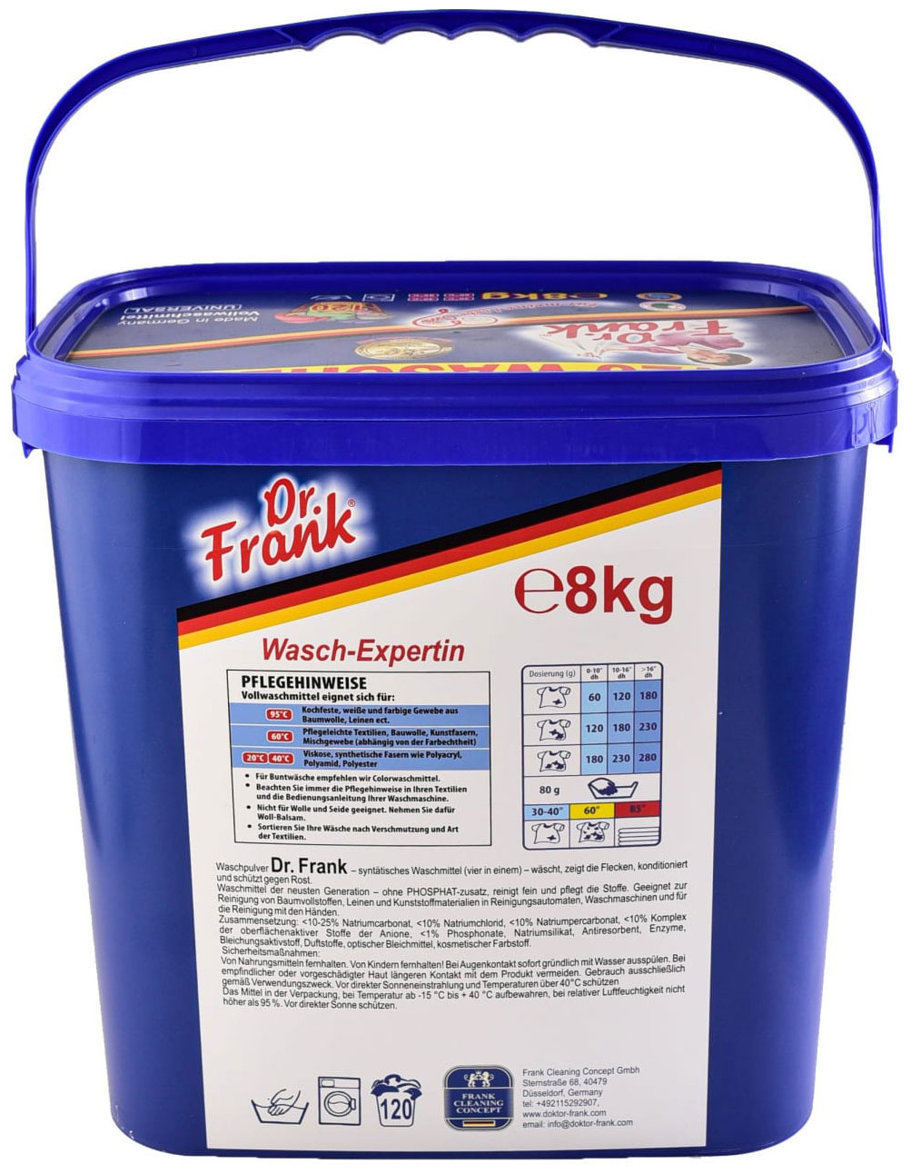Эффективен при температуре от 20 градусов.Немецкий стиральный порошок Dr.Frank НЕ СОДЕРЖИТ фосфаты и хлор, подходит для детского белья, аллергиков и людей с чувствительной кожей. Экологически чистый биоразлагаемый порошок для стирки имеет антибактериальный эффект и на 99 уничтожает микробы.