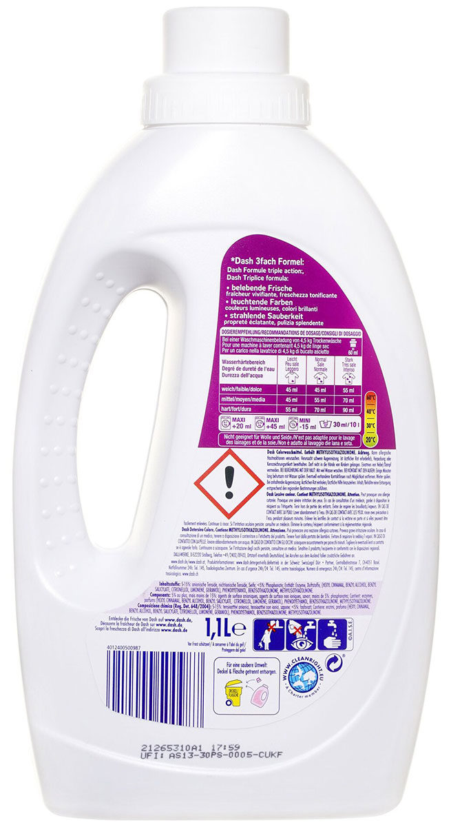 Экономично расходуется, для одной стирки достаточно 45 мл средства. Не содержит фосфатов. Избегайте использования с вещами из шерсти и шелка.Все продукты Dash являются климатически нейтральными с июля 2021 года, т.